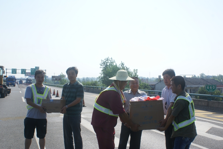 連日來,氣溫節(jié)節(jié)攀升,酷暑考驗著堅守在合六葉高速公路養(yǎng)護工程施工一線的職工。8月8日上午,公司領導及工會一行帶著毛巾、花露水、洗發(fā)液、香皂,急救藥箱及防暑降溫物品來到高速公路施工現場,親切慰問在烈日下仍辛勤地工作在工程施工最前線的一線職工??偨浝砣f世林詢問了他們在高溫天氣下的工作、生活情況,叮囑職工在當前持續(xù)高溫的不利條件下,安全做好工作的同時,注意休息,勞逸結合,合理調整工作作息時間,采取有效的防暑措施,安全順利地度過高溫季節(jié),保質保量的完成施工任務。