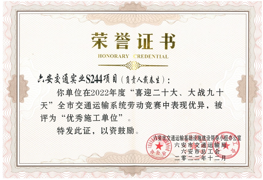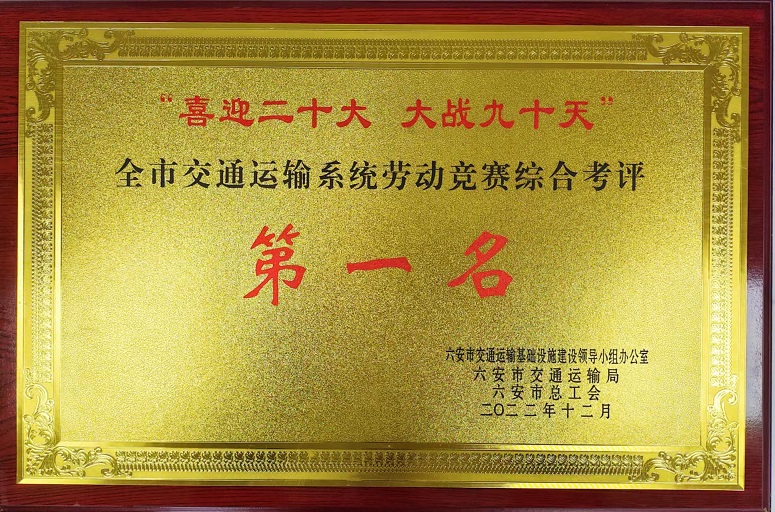 近日,公司在六安市交通運輸局和六安市總工會組織的“喜迎二十大、大戰(zhàn)九十天”全市交通運輸系統(tǒng)勞動競賽綜合考評中獲第一。同時參與建設(shè)的S244羅崗至分路口段公路工程(二期)03合同段項目和G237六安馬頭至舒城萬佛湖工程(一期)項目在勞動競賽中被評為“優(yōu)秀施工單位”。